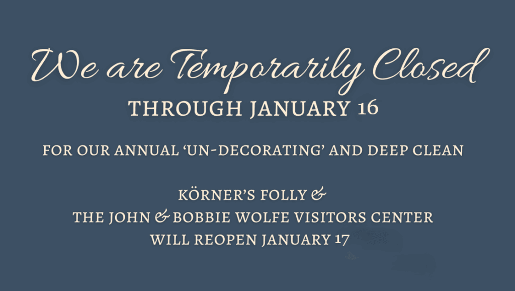 - Sponsor a Major Restoration Project: We are restoring new rooms in Körner’s Folly each year. Consider making a lasting impact with a restoration project on behalf of your company.
